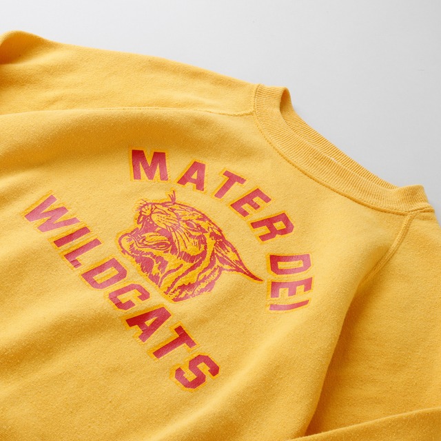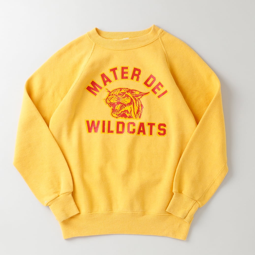 【極美品】60s special vintage raglan sweat shirt "MATER DEI WILDCATS" made in USA fade yellow about size S / 60年代 ヴィンテージ 長袖 ラグラン袖 スウェットシャツ トレーナー USA製 実寸S フェード イエロー