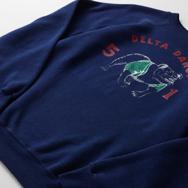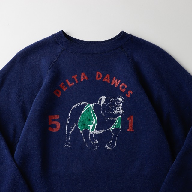 【極美品】50s special vintage military raglan sweat shirt U.S. ARMY "DELTA DAWGS" Flocky Print made in USA fade navy big size / 50年代 ヴィンテージ 長袖 ラグラン袖 スウェットシャツ トレーナー USA製 アメリカ軍 ミリタリー 実寸サイズL ビッグサイズ フェード ネイビー フロッキープリント 激レア
