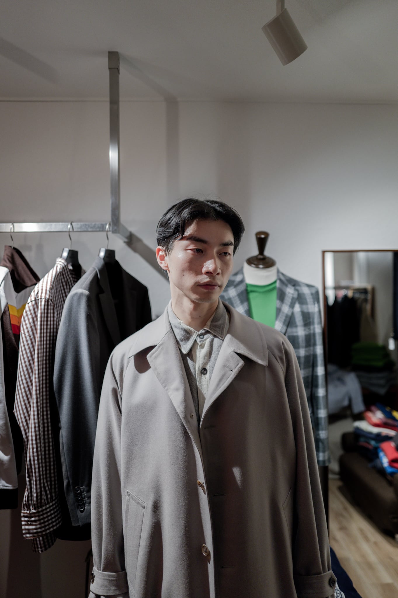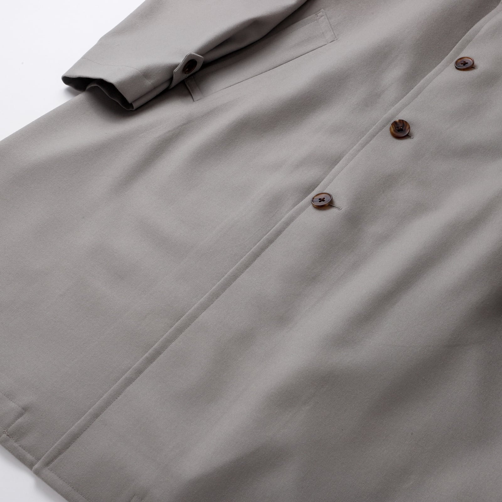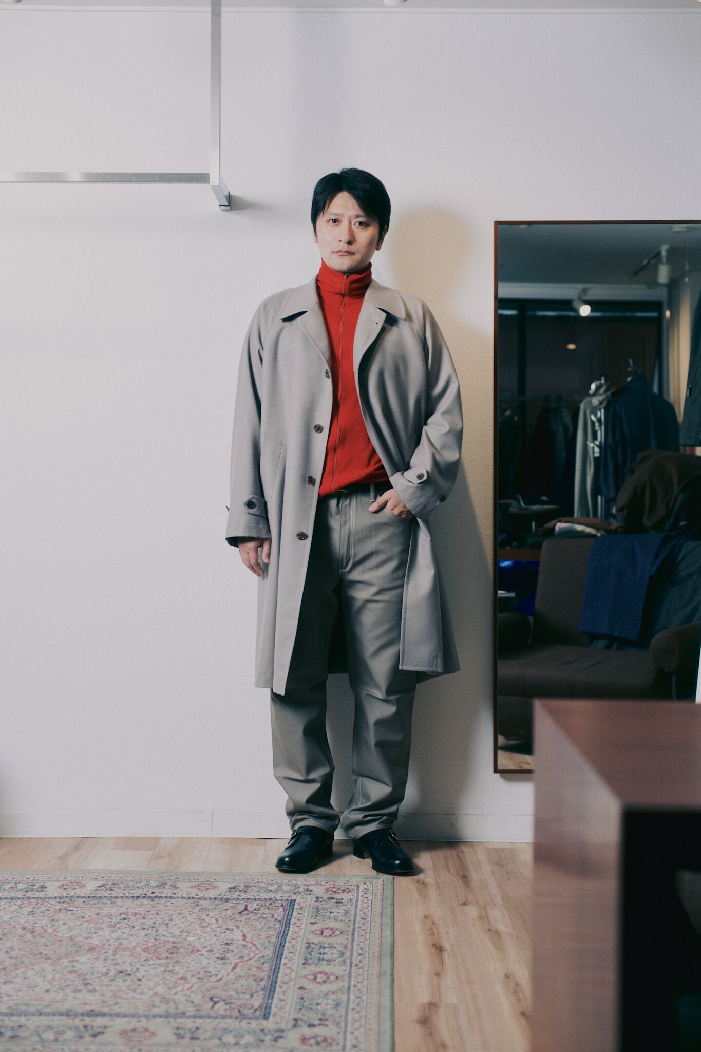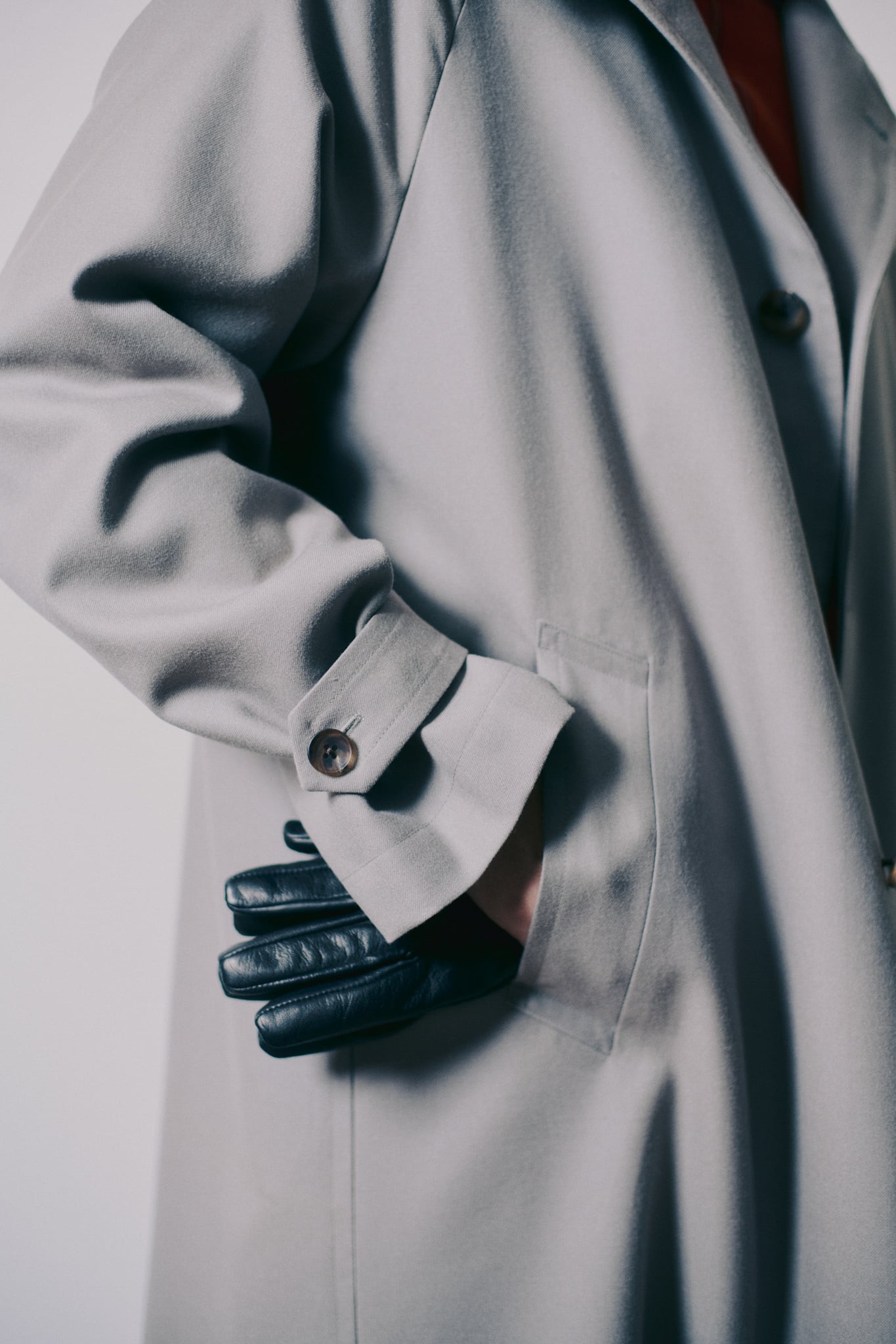 古い年代の英国製 一枚袖コートを参考に、身幅にゆとりを持たせつつ着丈もアレンジ。
