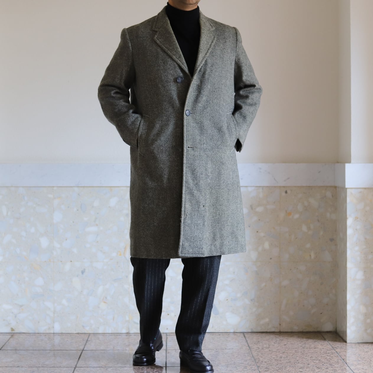 【美品】50s MITSUKOSHI bespoke special vintage wool tweed Coat Balmacaan long coat Made in JAPAN Big size Mint condition / 50年代 日本橋 三越 ビスポークコート スペシャル ヴィンテージ ウール ツイード コート バルマカーンコート ヴィンテージ チェスターコート ステンカラー コート ロングコートヘリンボーン 日本製 グレー 実寸L