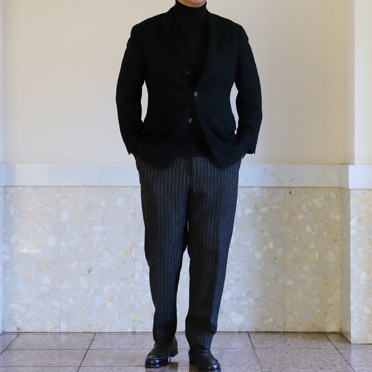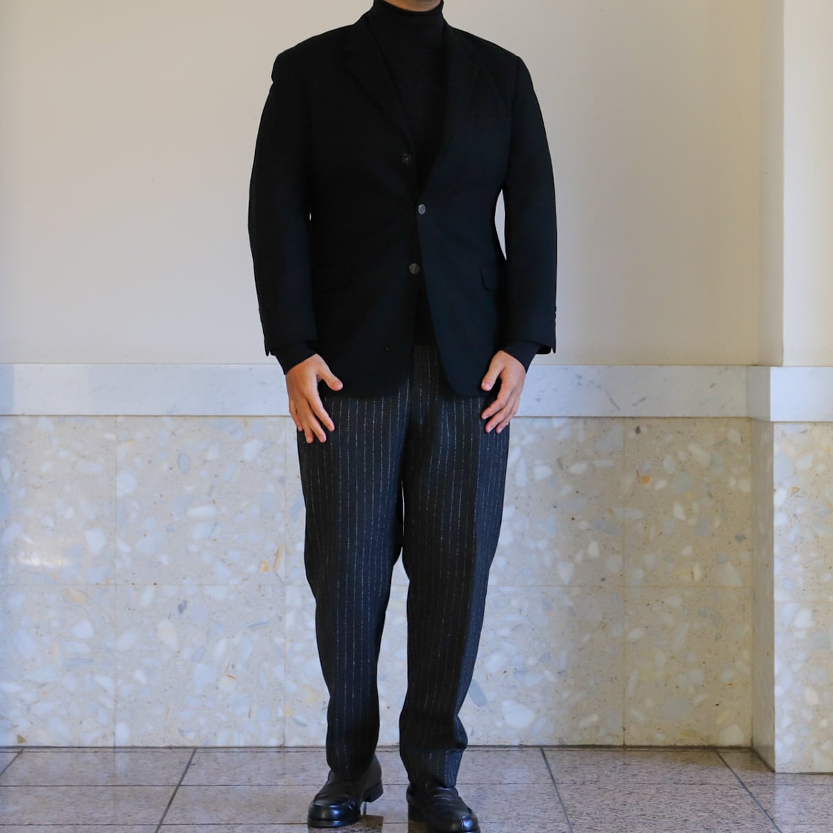 フォーマル合わせでも素敵ですが、サラッと羽織ってスラックスやデニム、ミリタリー パンツなどに合わせるのも抜群。
