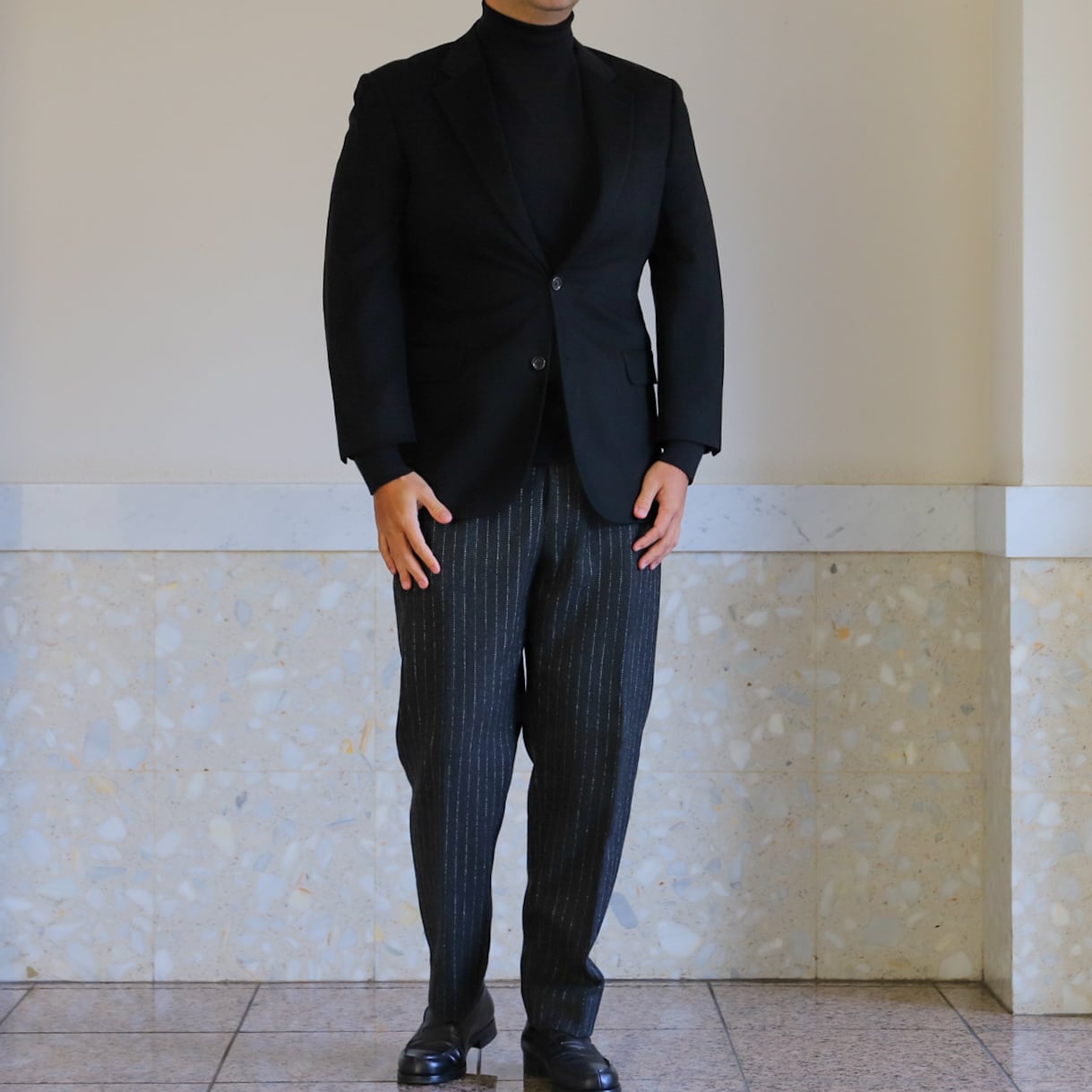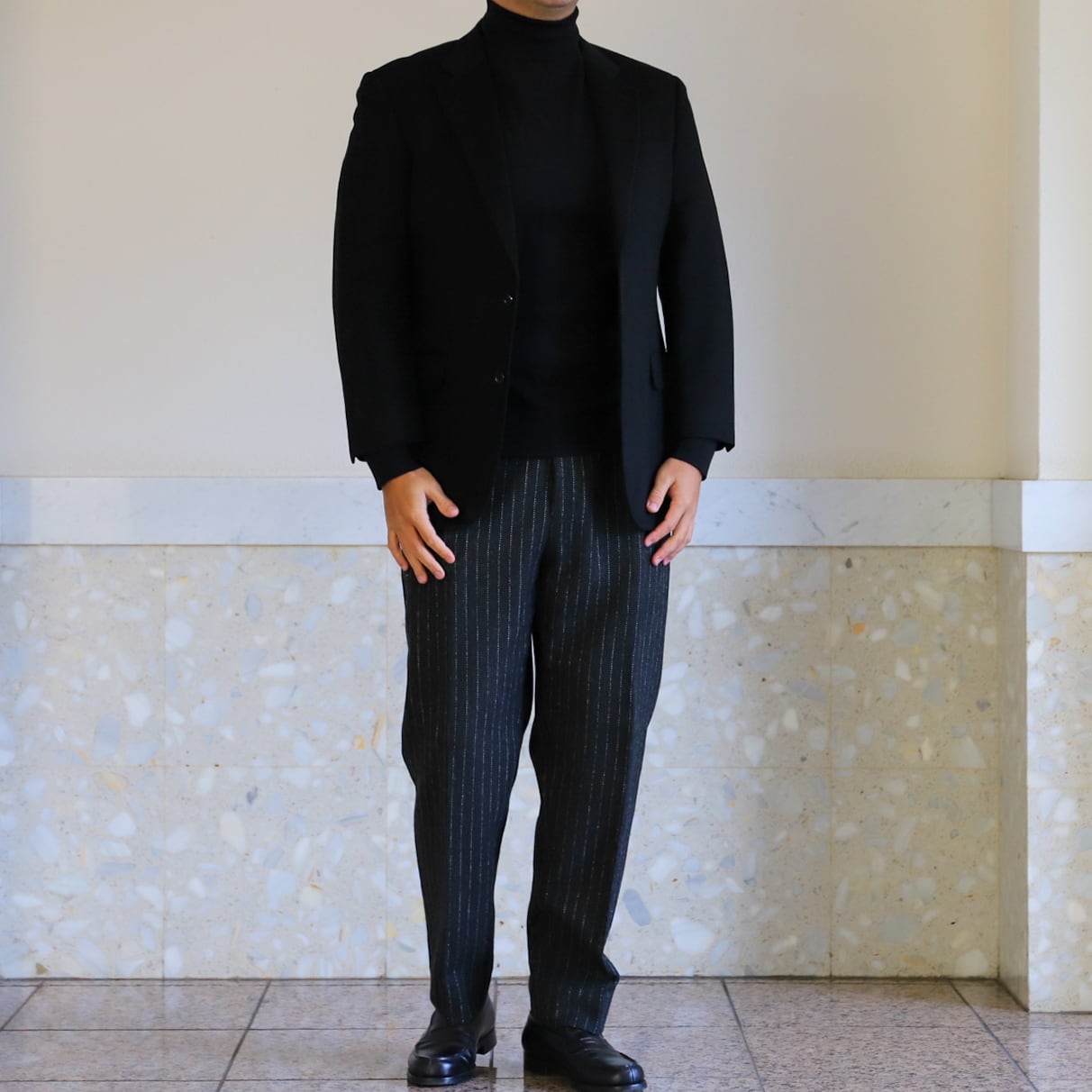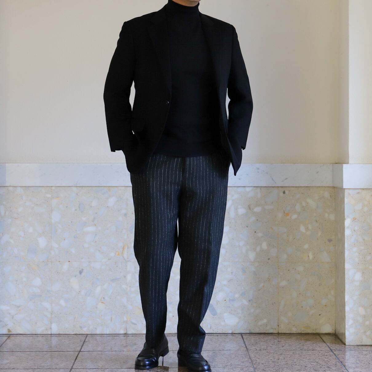 フォーマル合わせでも素敵ですが、サラッと羽織ってスラックスやデニム、ミリタリー パンツなどに合わせるのも抜群。