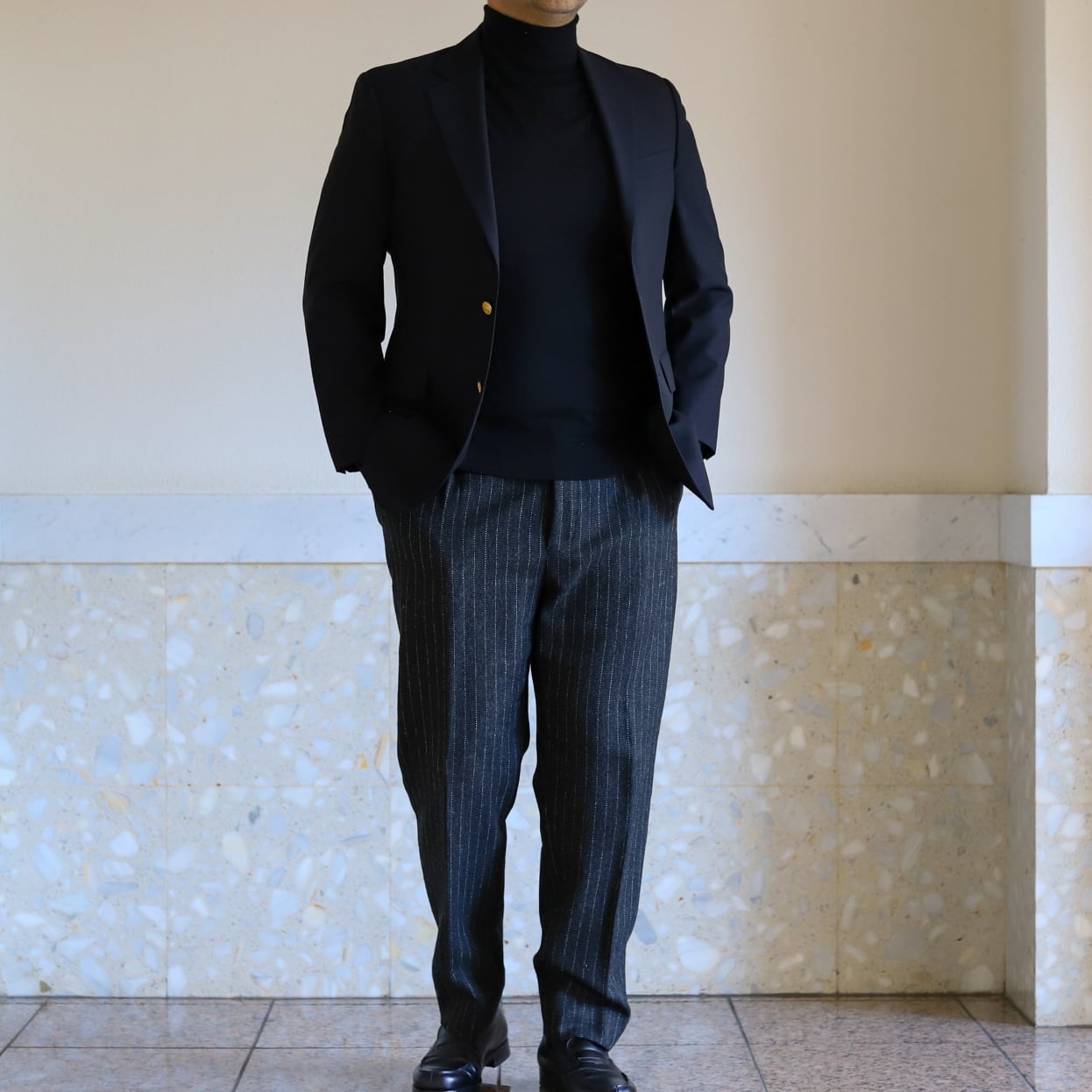 フォーマル合わせでも素敵ですが、サラッと羽織ってスラックスやデニム、ミリタリー パンツなどに合わせるのも抜群。