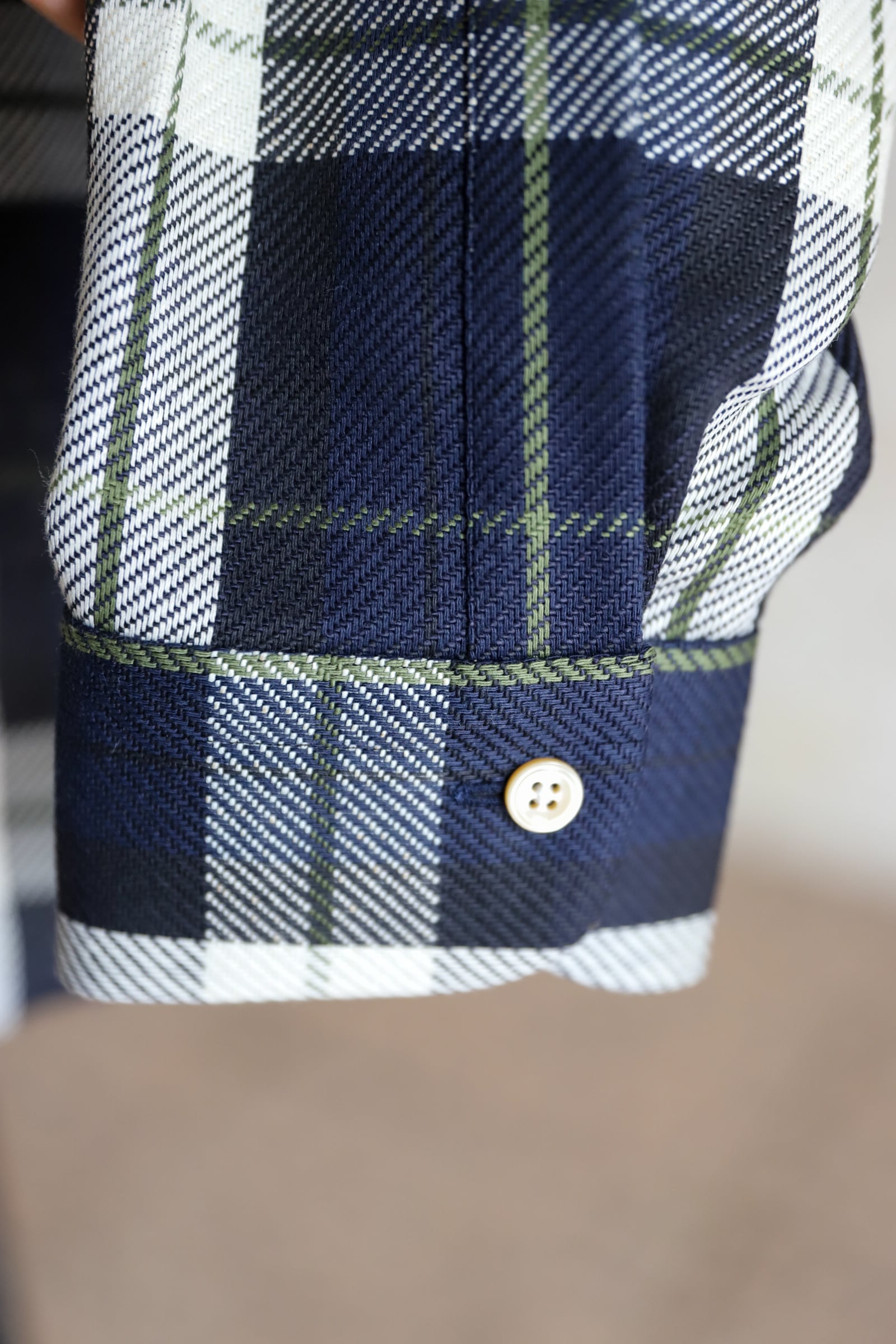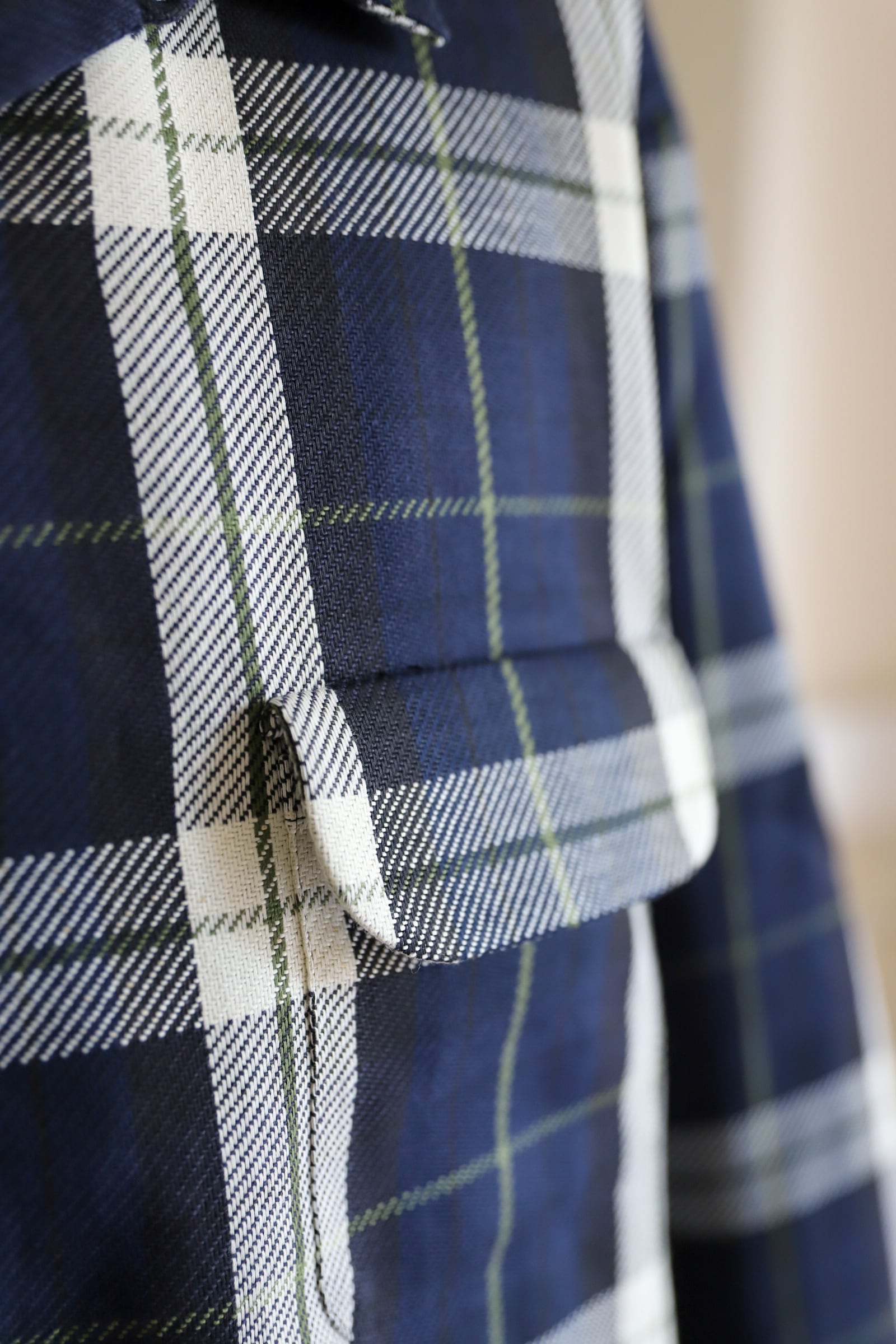 特質ポイントは、ヴィンテージ生地を使用しヴィンテージ古着や既存のヘビーネルシャツでは、コスト面でまずやらない、ポケットやフロント、バックのチェック柄を全て合わせて縫製。