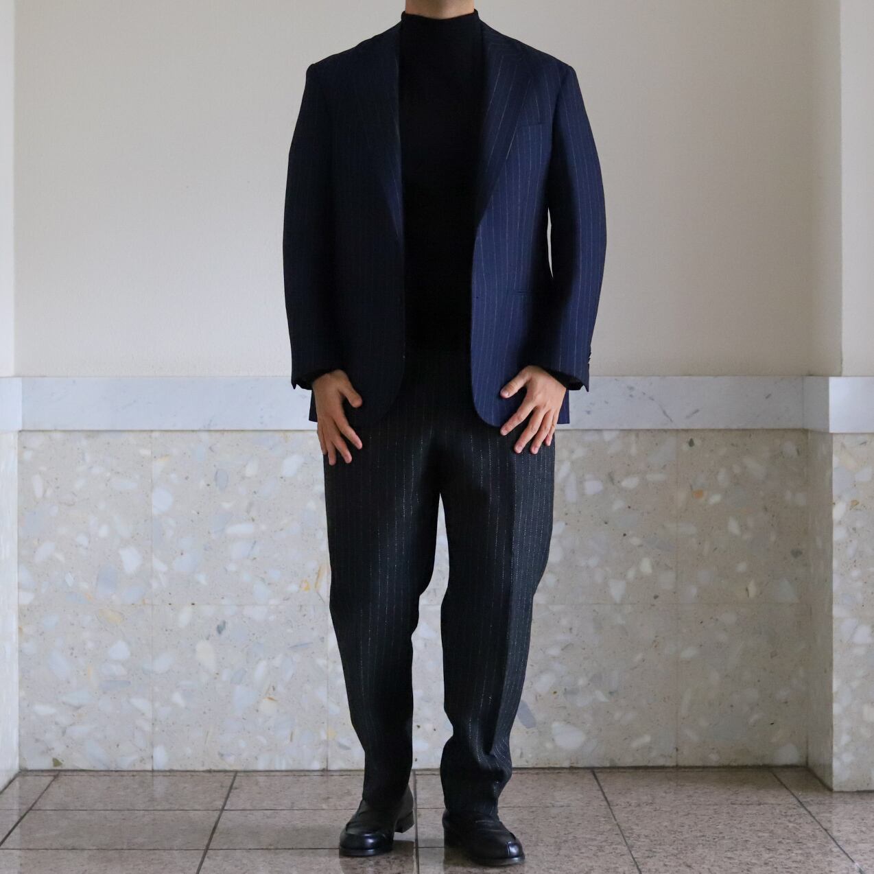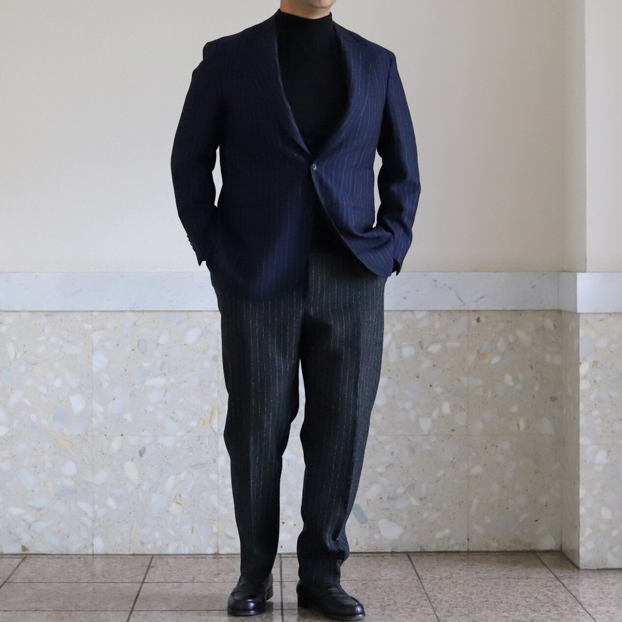 ラペルの太さやシルエットなど、身幅にややゆとりを持たせつつ着丈もアレンジ。
