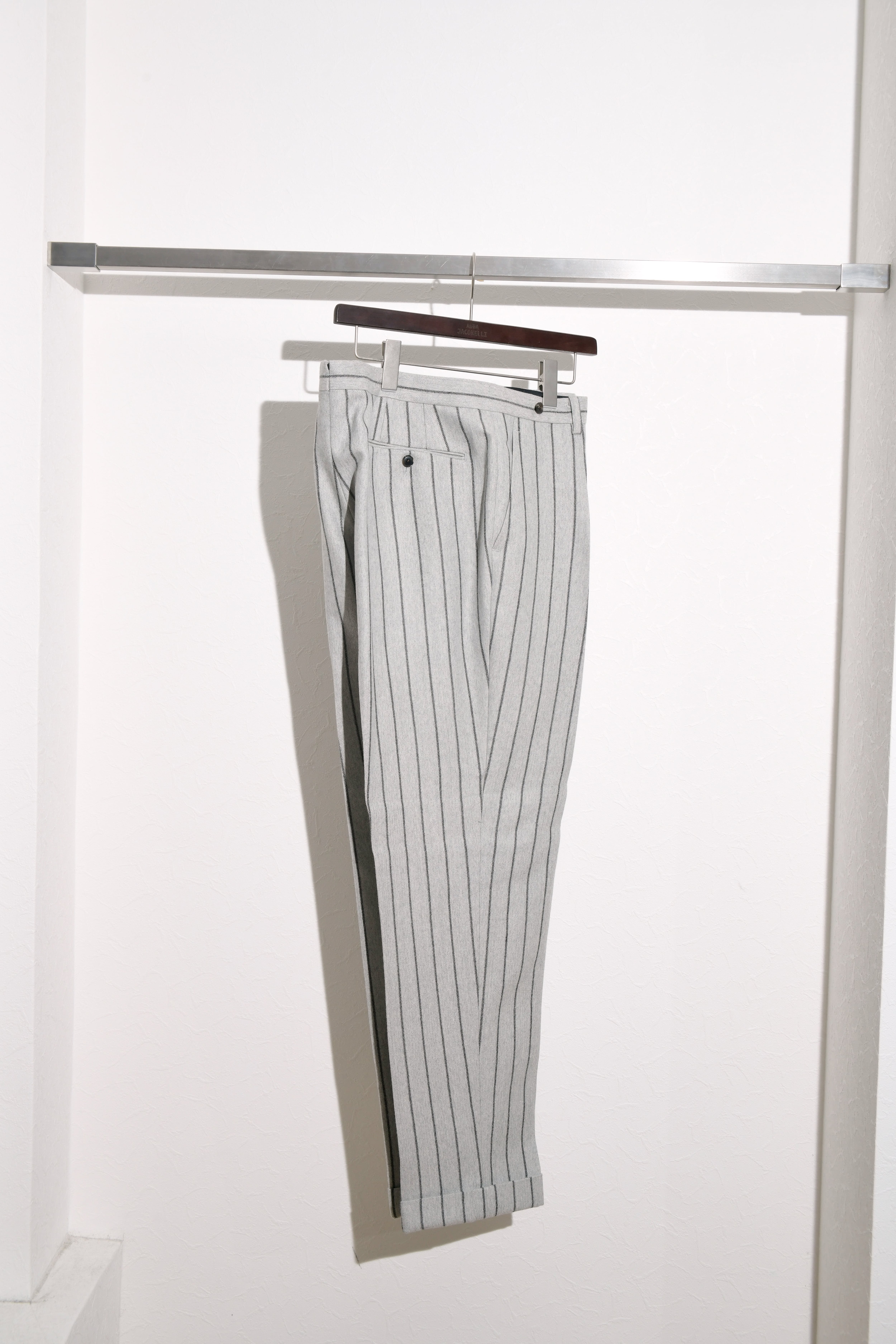 古い年代のスラックスを参考にベルトレス、インサイド1タックに製作。