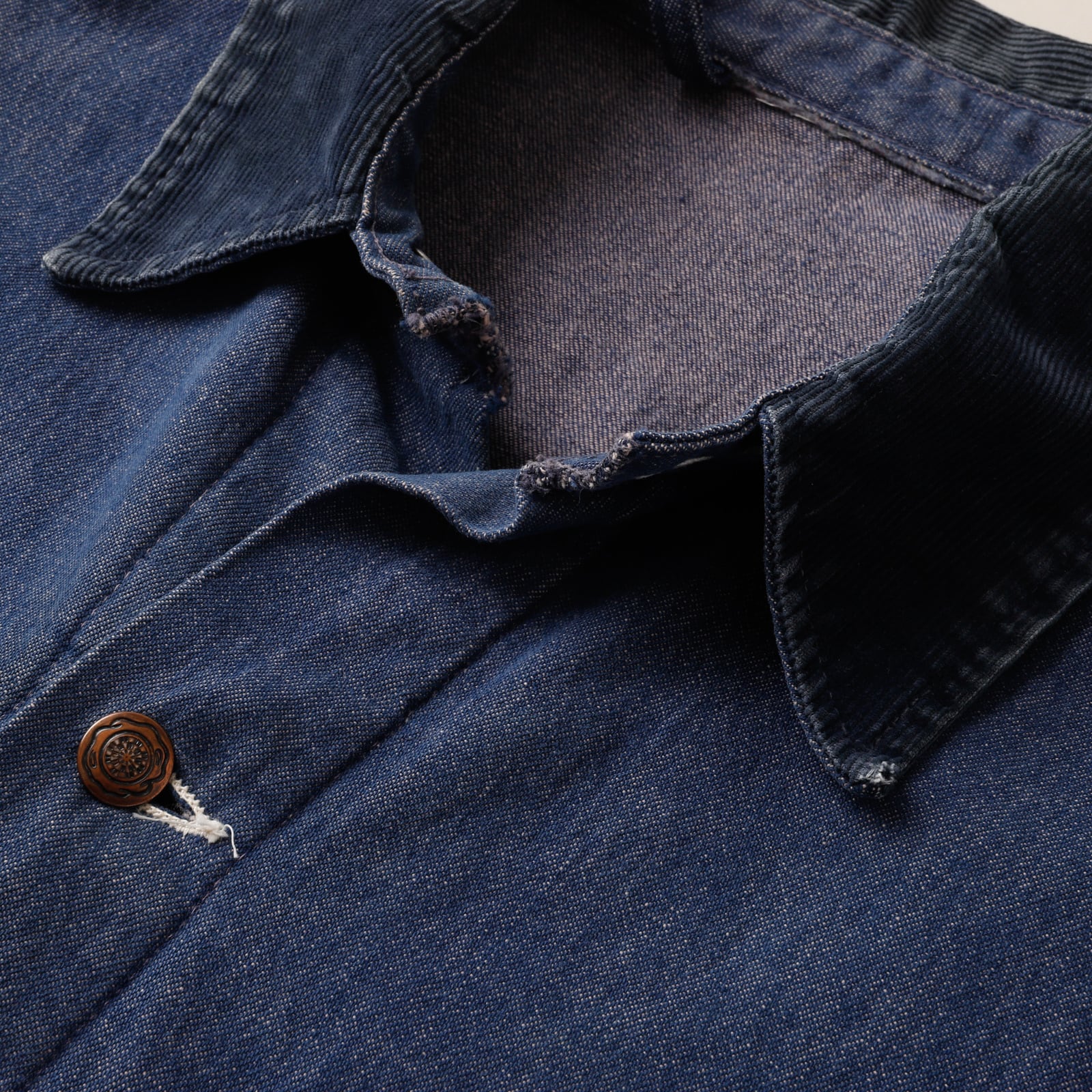 1970年代ならではのシルエット、ホワイトステッチ、ボタン、生地感になります。