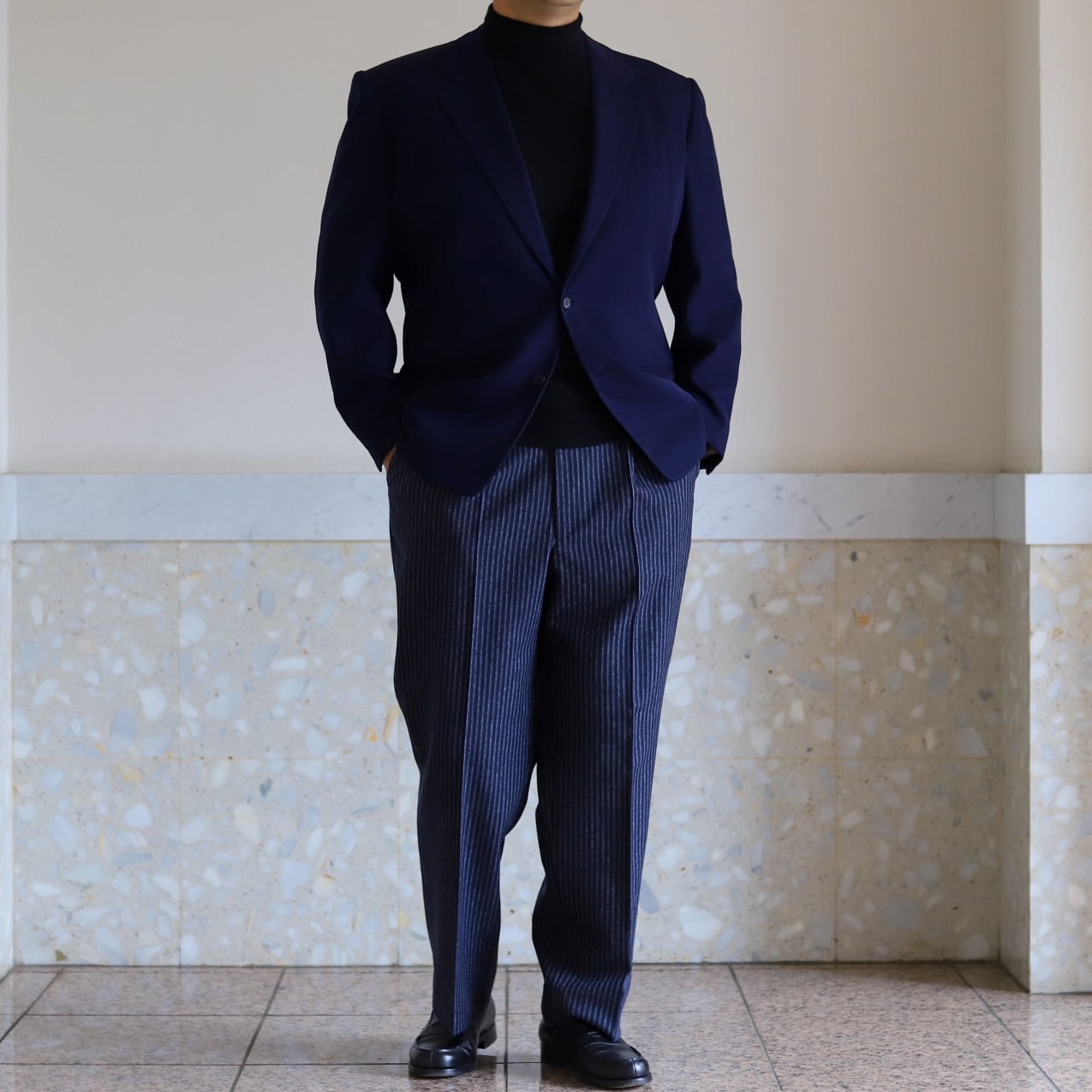 フォーマル合わせでも素敵ですが、サラッと羽織ってスラックスやデニム、ミリタリー パンツなどに合わせるのも抜群。