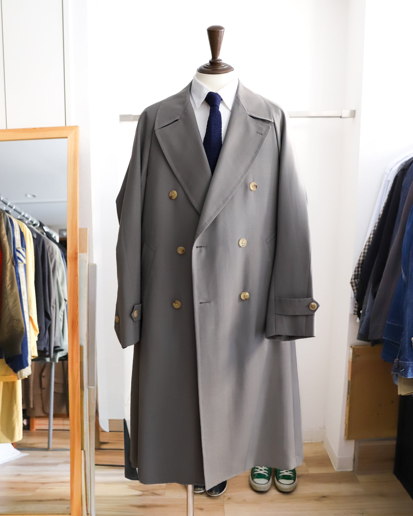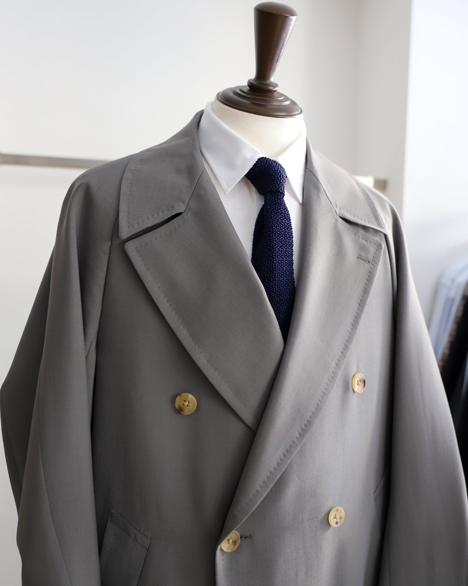 古い年代の英国製ダブルコートを参考に、ラペルの太さやシルエットなど身幅にゆとりを持たせつつ着丈もアレンジ。