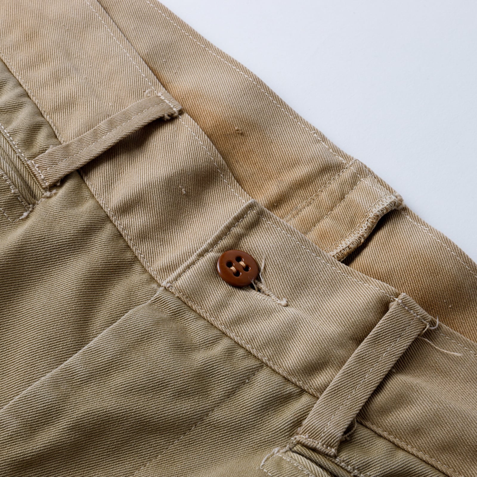 【極美品】40s ARMY CLOTH CHINO PANTS TROUSERS WORK PANTS W35 mint condition made in USA/ 40年代 チノヴィンテージ パンツ チノパンツ チノトラウザーズ ベージュカーキ 2トーンカラー 第二次世界大戦頃 ミントコンディション 尿素ボタン ボタンフライ 実寸W35 激レア