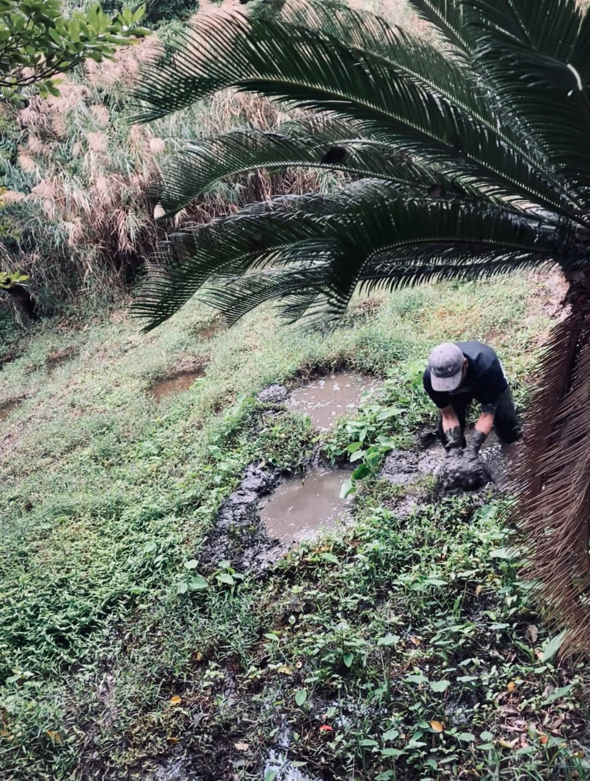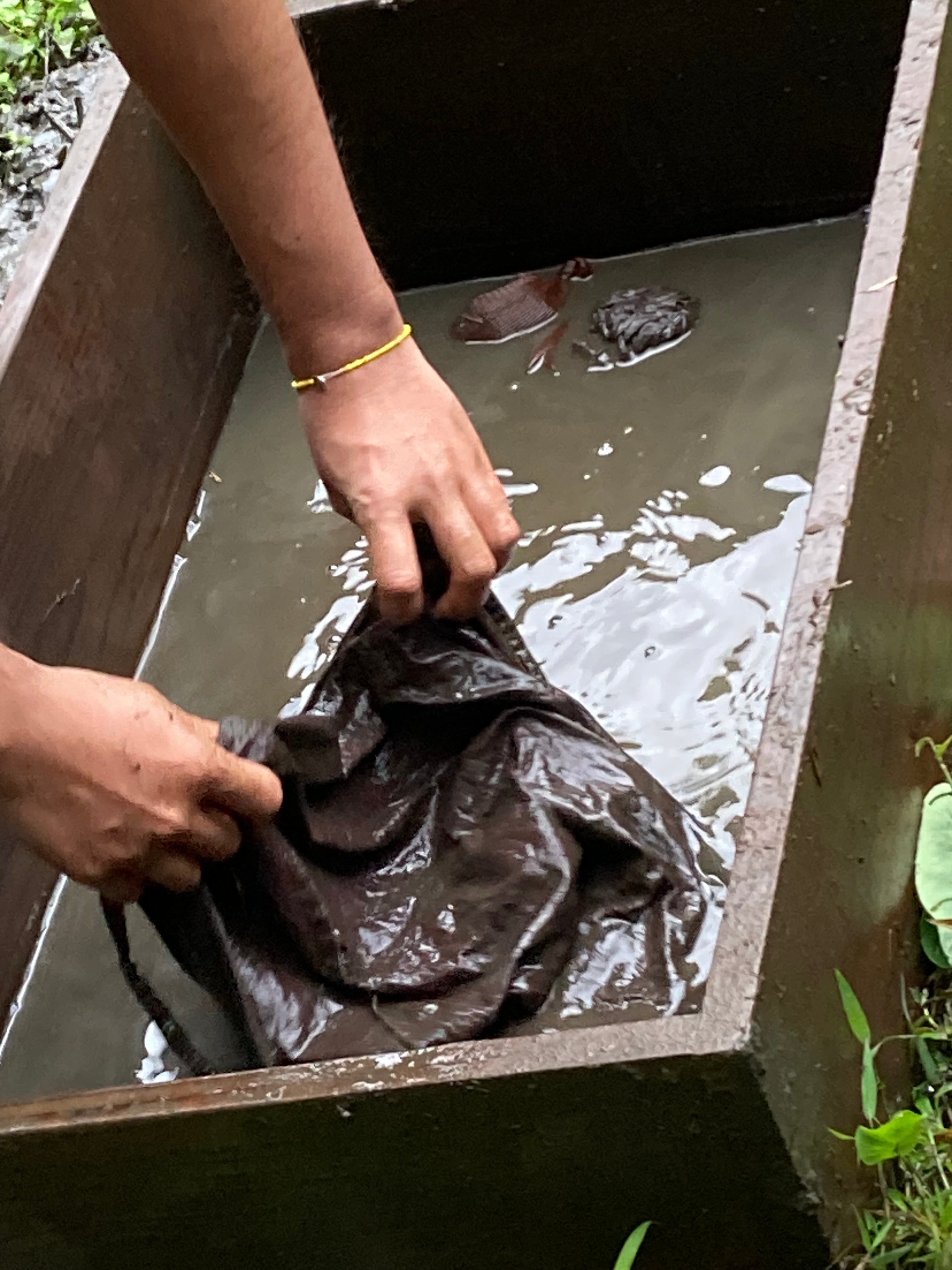 天然の泥田で染めた後は、自然の川で不純物を洗い流し、1日を通して全工程を3~4回繰り返して染め上げております。