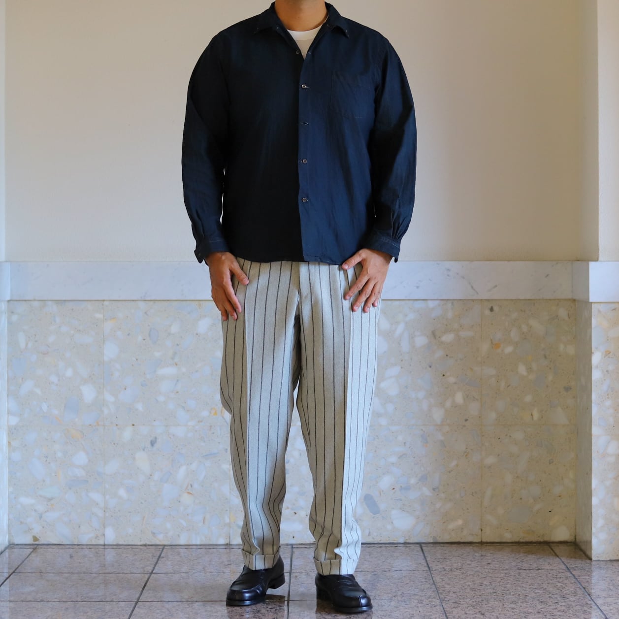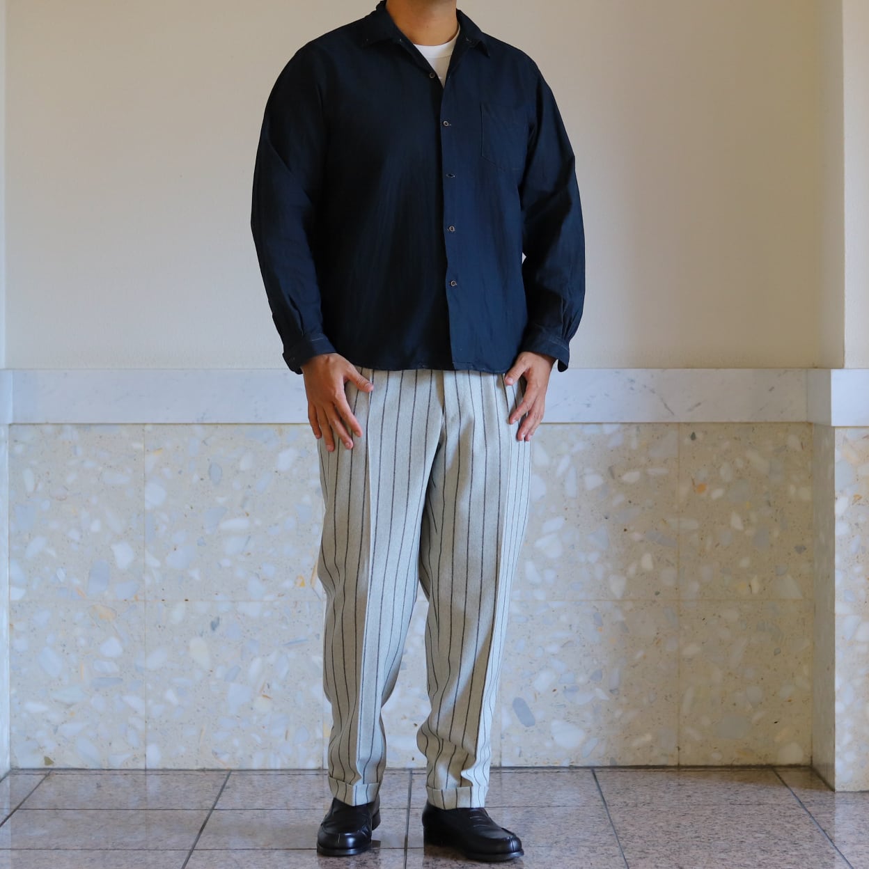 もちろんシャツ一枚で着るのも素敵ですが、ゆったりシルエットのシャツにあえて大きめの紺ブレやGジャンにチノパンやミリタリーパンツ、ジーンズや短パン合わせなども上品な組み合わせです。