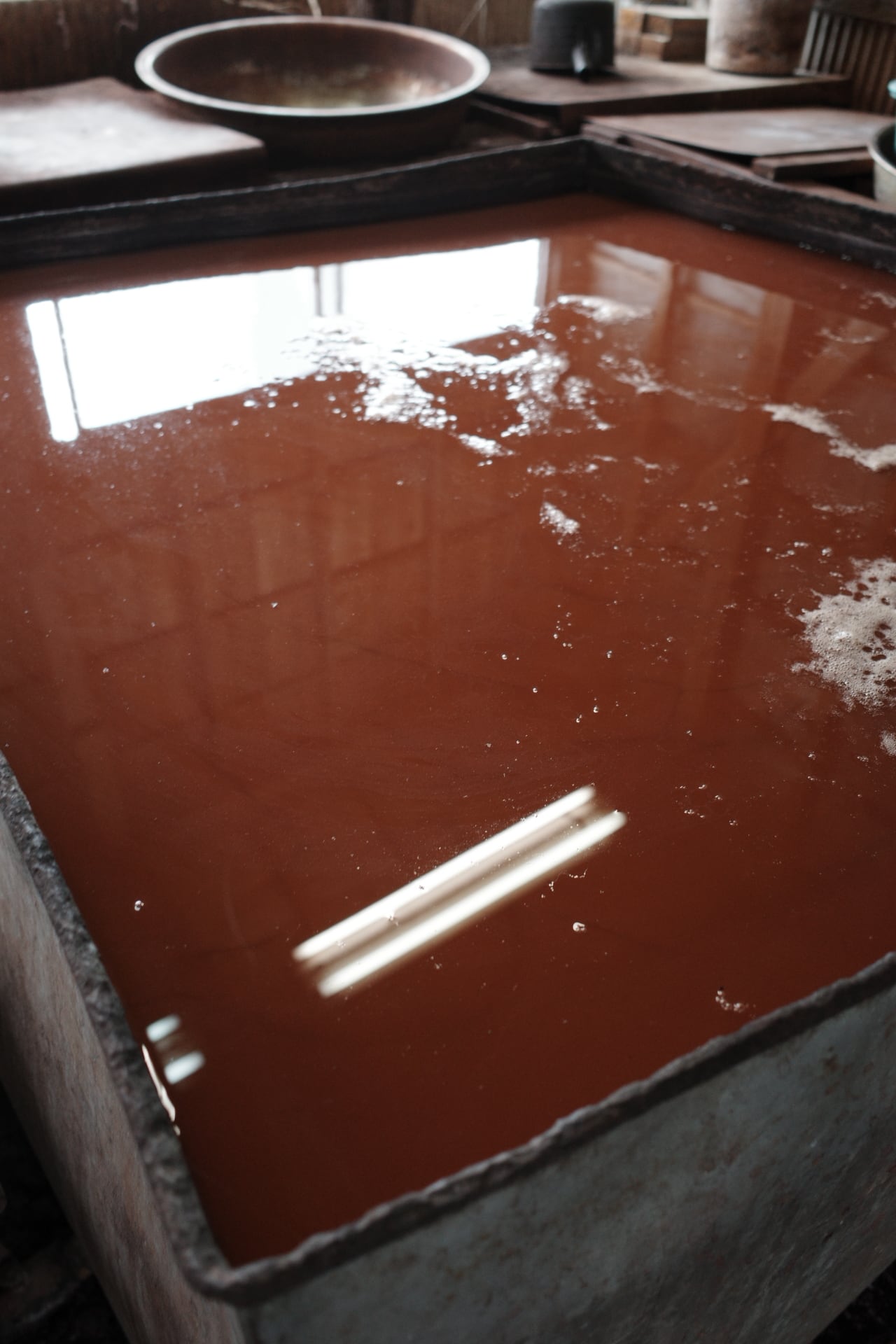 泥藍染とは、江戸時代から続く、奄美でしか染められない技法。自然界からとれる原料、島に自生するシャリンバイの幹をチップにし大きな窯で煮出して発酵させ、その茶褐色になった煮汁で染めた色から偶然に生まれた泥染の技法。