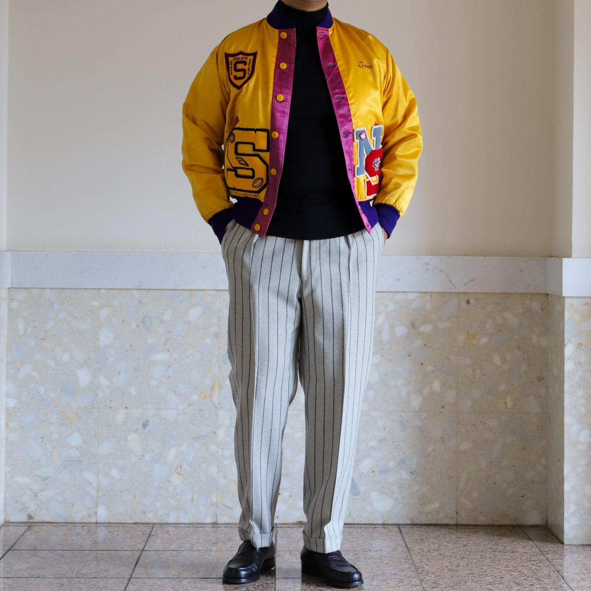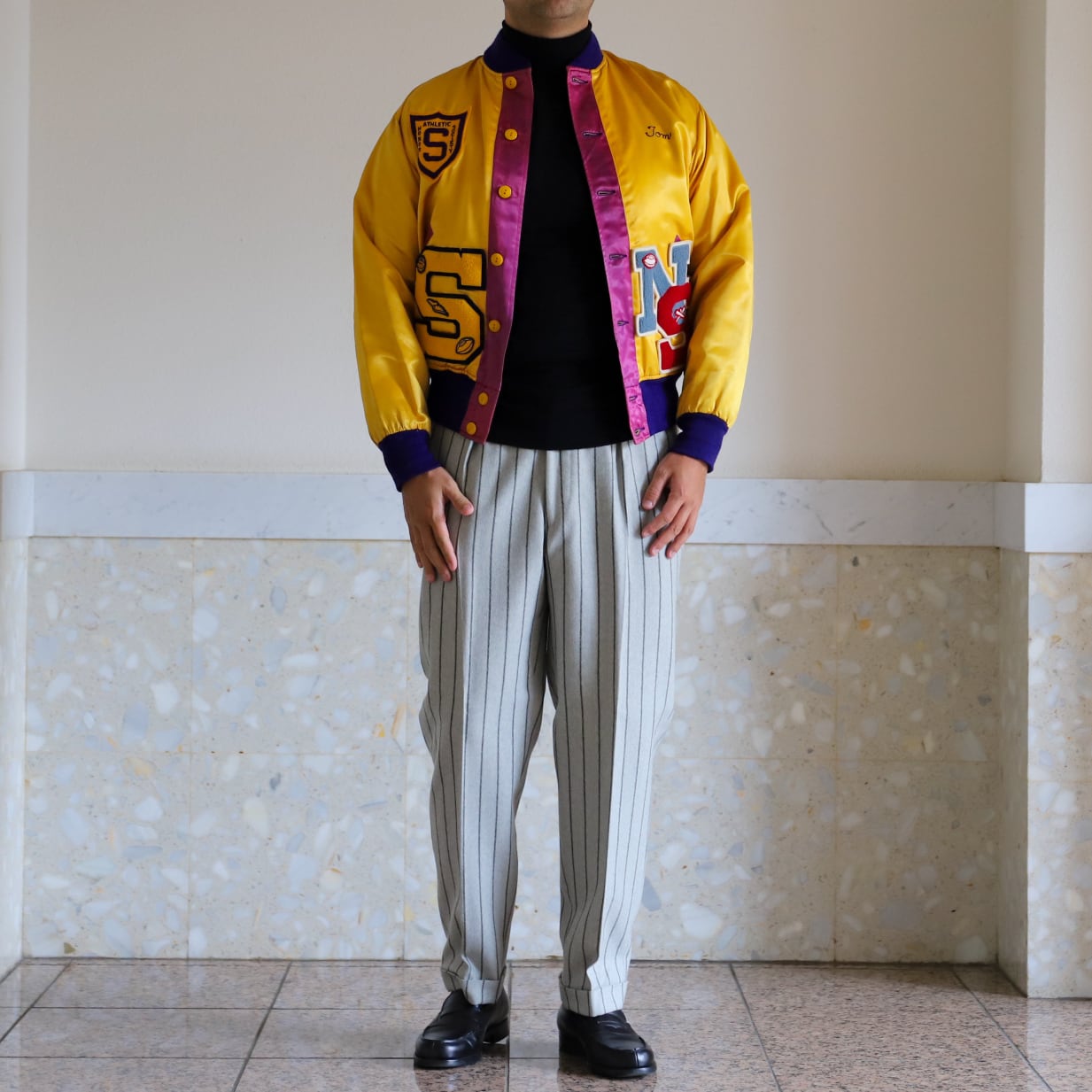 【極美品】40s special vintage jacket satin fabric blouson made in USA mint condition/ 1940年代 ヴィンテージ アメリカ製 サテン ジャケット ブルゾン 実寸サイズ42 実寸L USA製 マスタードカラー ワッペン 刺繍 ミントコンディション