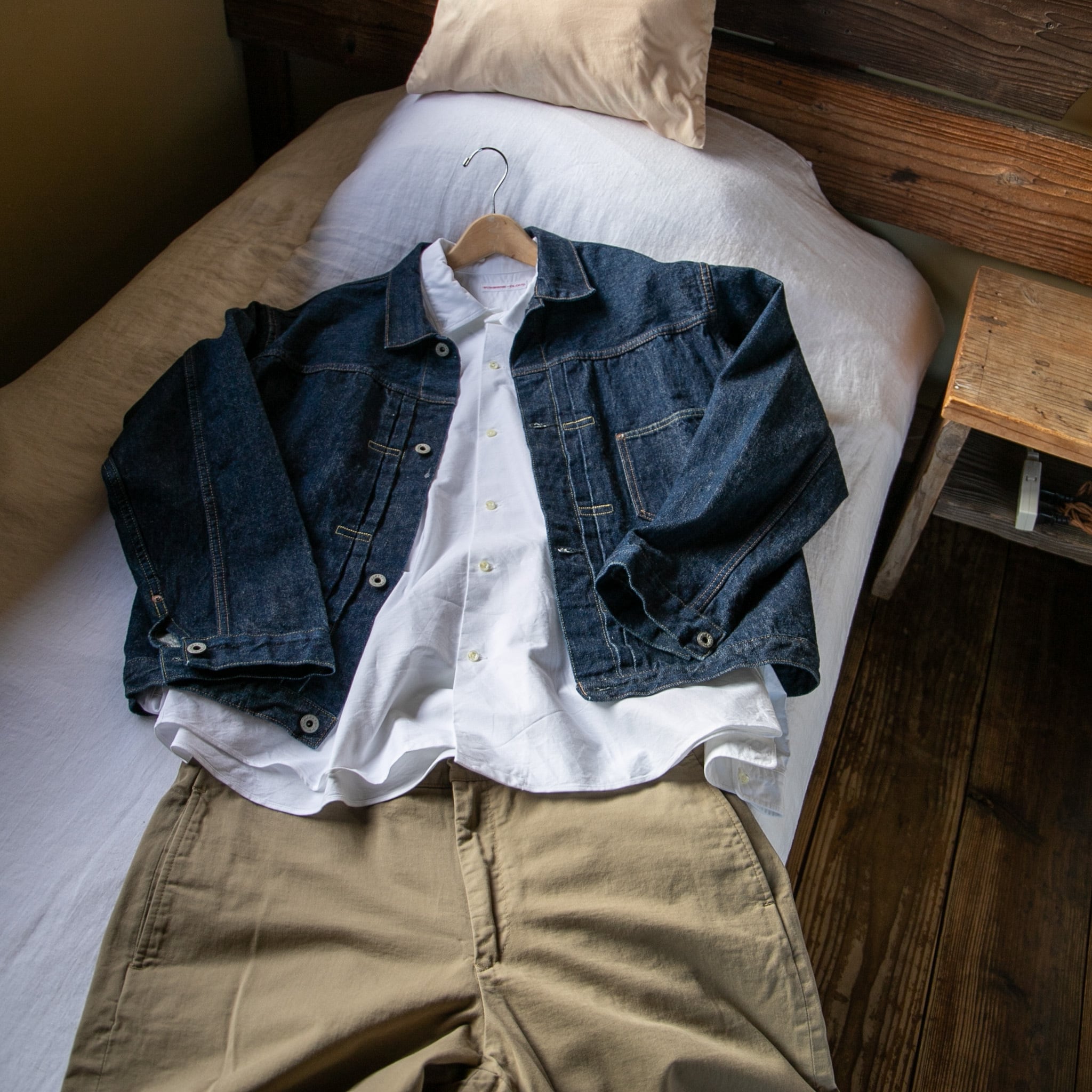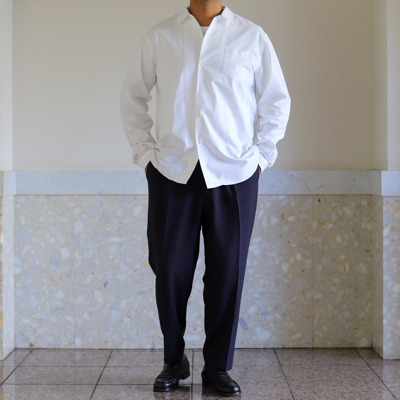 もちろんシャツ一枚で着るのも素敵ですが、ゆったりシルエットのシャツにあえて大きめの紺ブレやGジャンにチノパンやミリタリーパンツ、ジーンズや短パン合わせなども上品な組み合わせです。