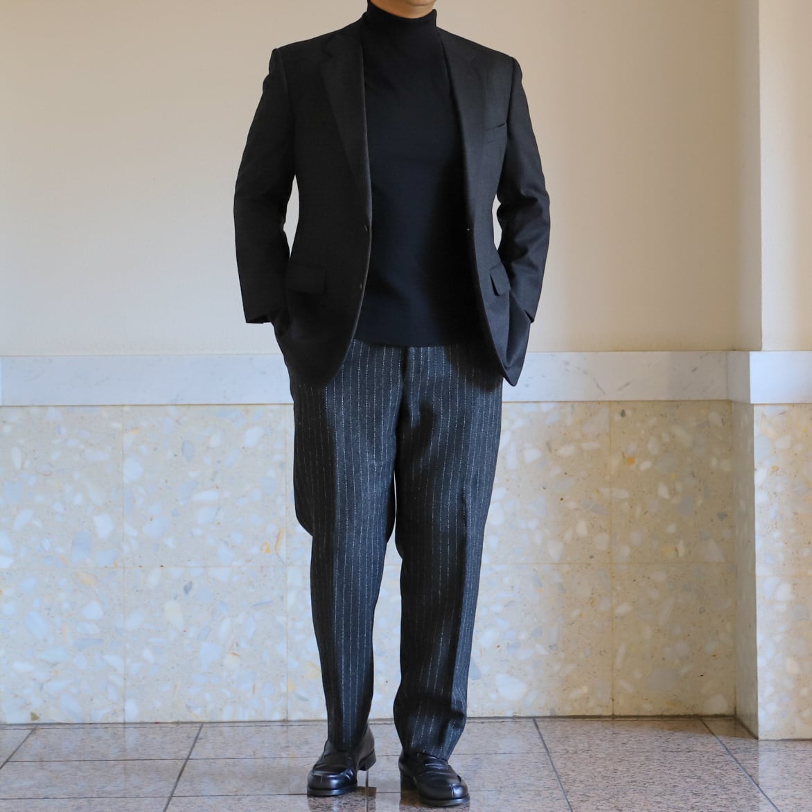 フォーマル合わせでも素敵ですが、サラッと羽織ってスラックスやデニム、ミリタリー パンツなどに合わせるのも抜群。