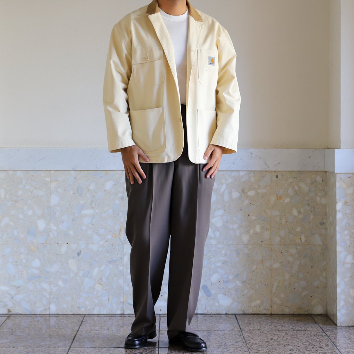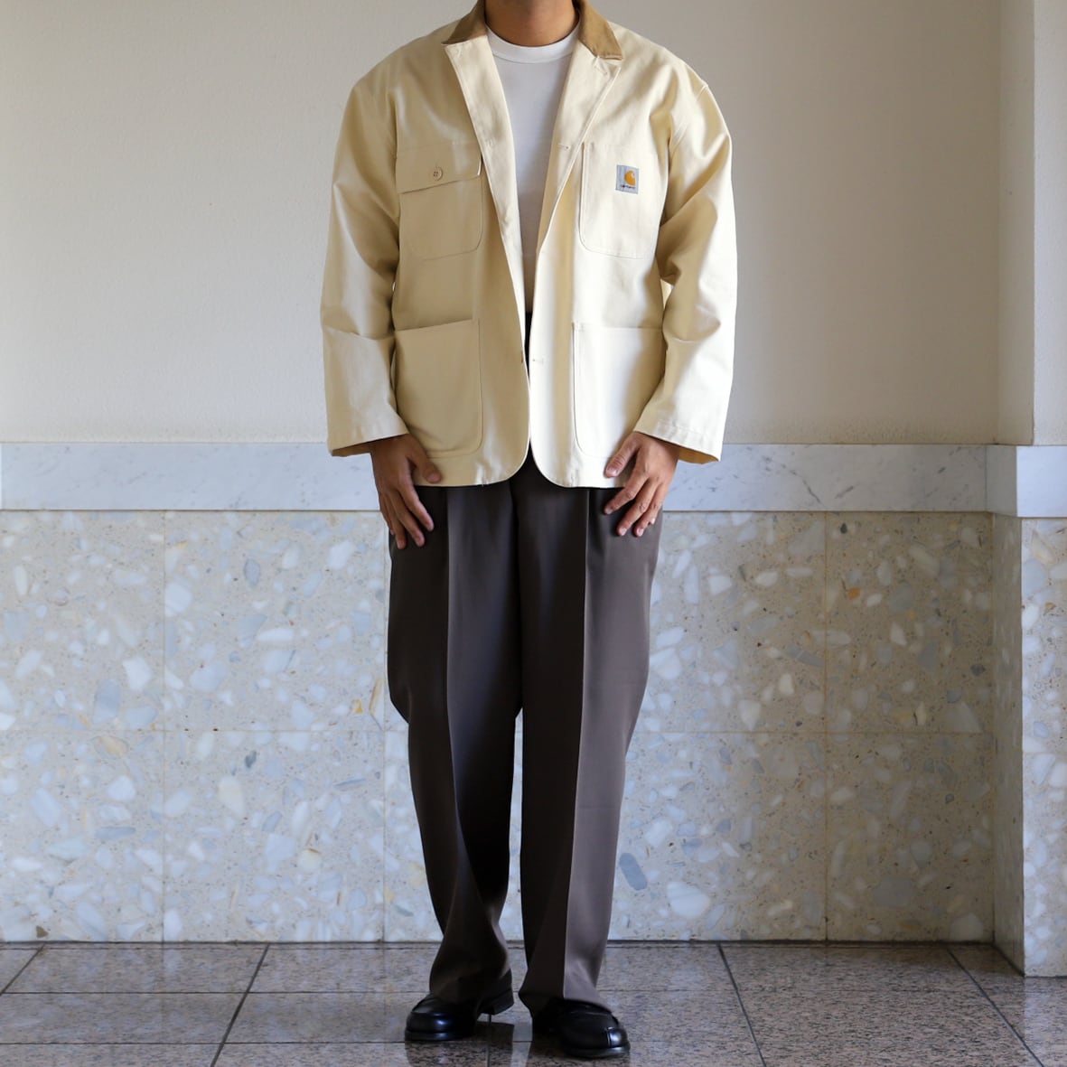 シャツをインしてジャケットパンツスタイルの組み合わせでもいいですが、カジュアルにオーバーサイズのTシャツやシャツ、ニットなどをサラッと羽織るのもお勧め。