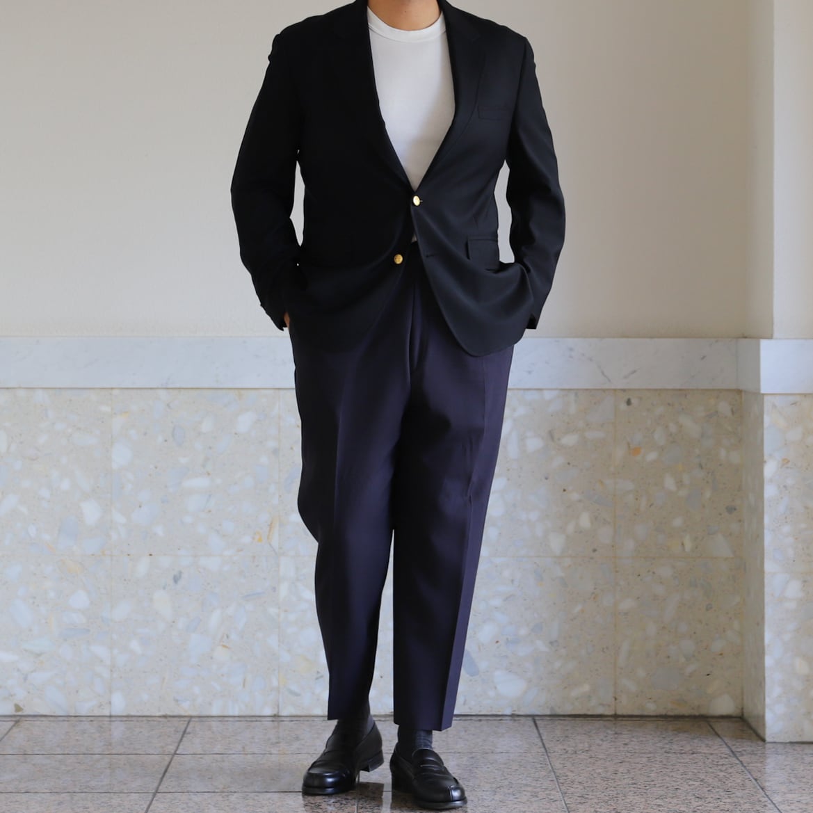 フォーマル合わせでも素敵ですが、サラッと羽織ってスラックスやデニム、ミリタリー パンツなどに合わせるのも抜群。