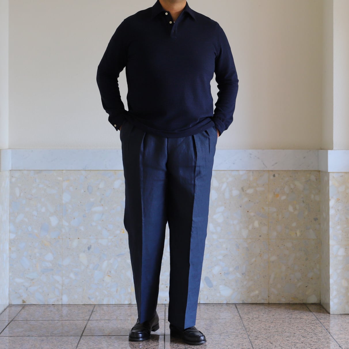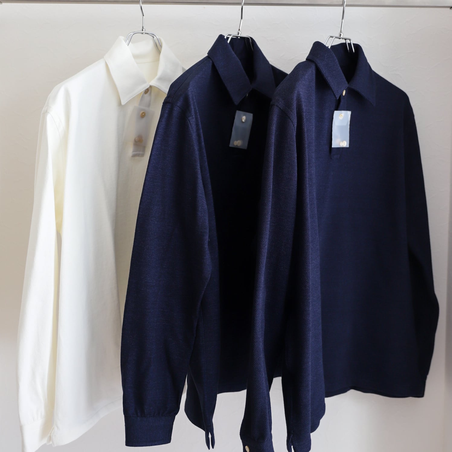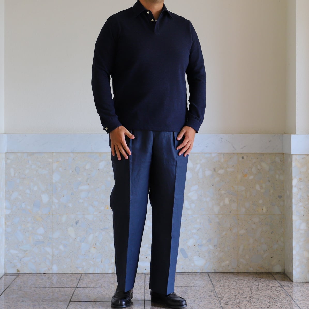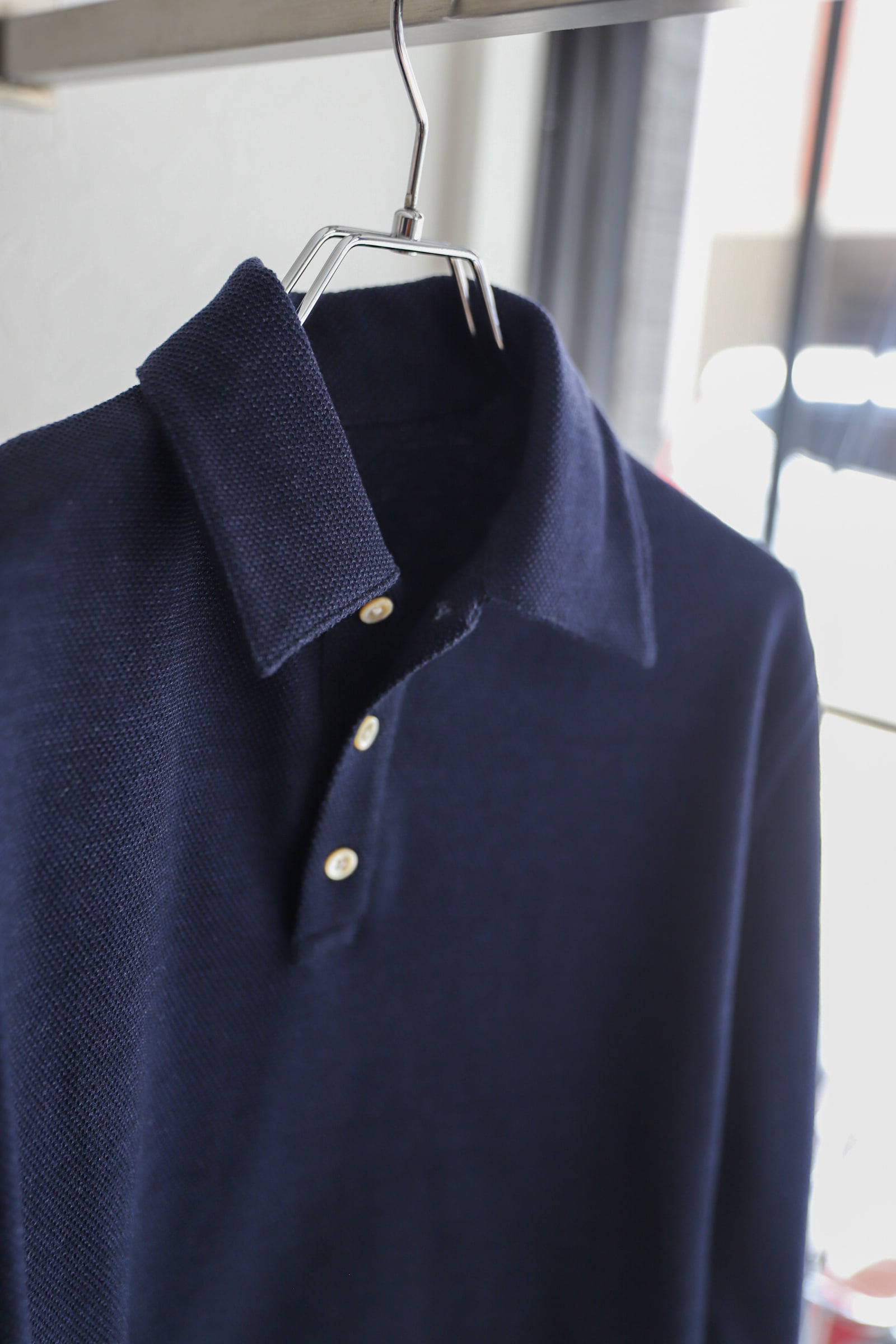 今回はオーナー自身が着たいと思うシルエットを、ヴィンテージエルメスのニットポロシャツ、フレンチヴィンテージポロシャツから着想を得て、体格が良くても上品に着られる、スタイルが良く見える、そして着用すると背筋がシャキッとするような、ドレス寄りの長袖ポロシャツです。