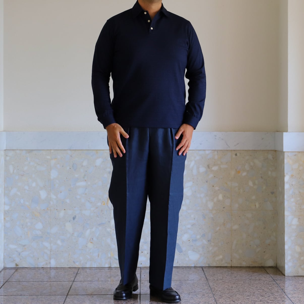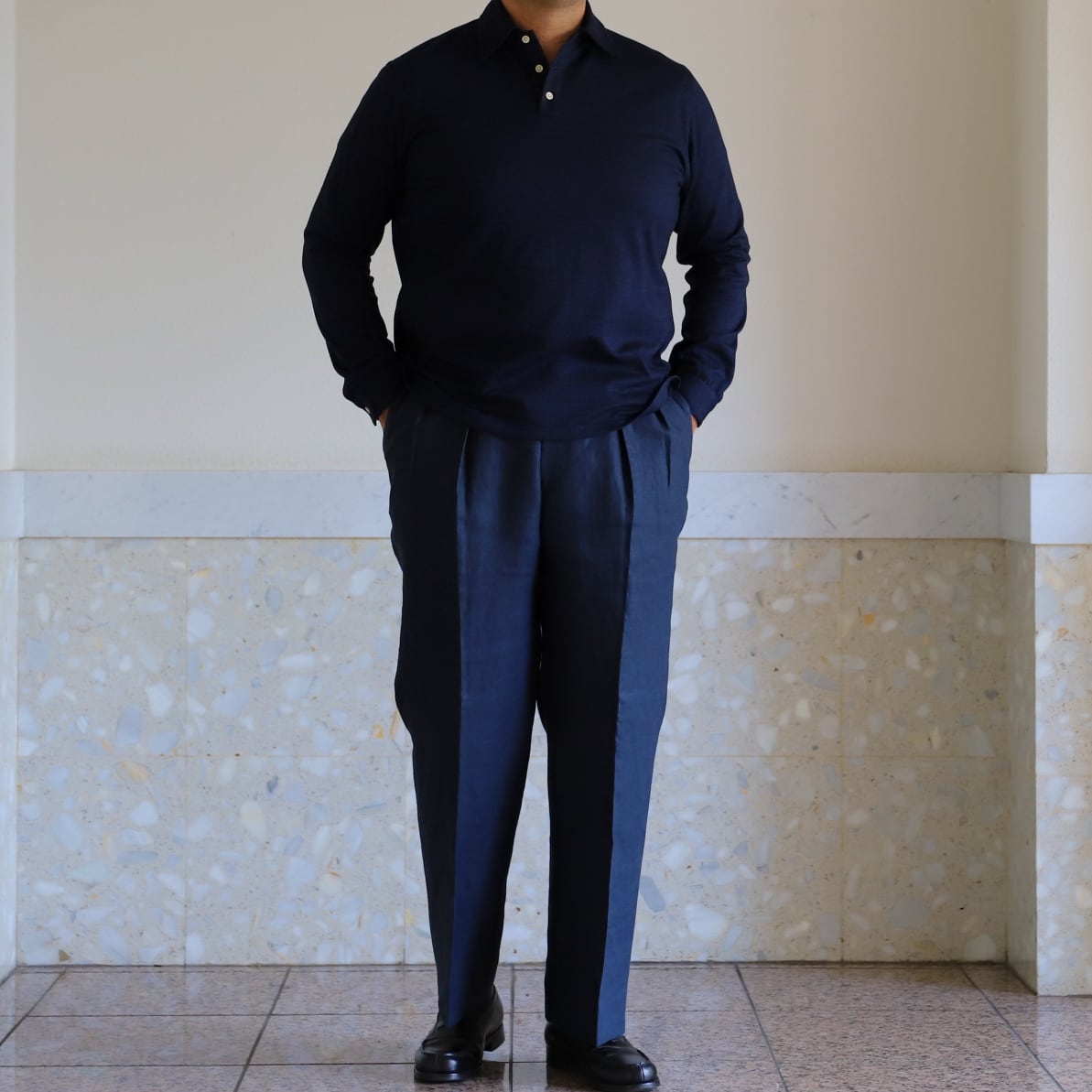 今回はオーナー自身が着たいと思うシルエットを、ヴィンテージエルメスのニットポロシャツ、フレンチヴィンテージポロシャツから着想を得て、体格が良くても上品に着られる、スタイルが良く見える、そして着用すると背筋がシャキッとするような、ドレス寄りの長袖ポロシャツです。