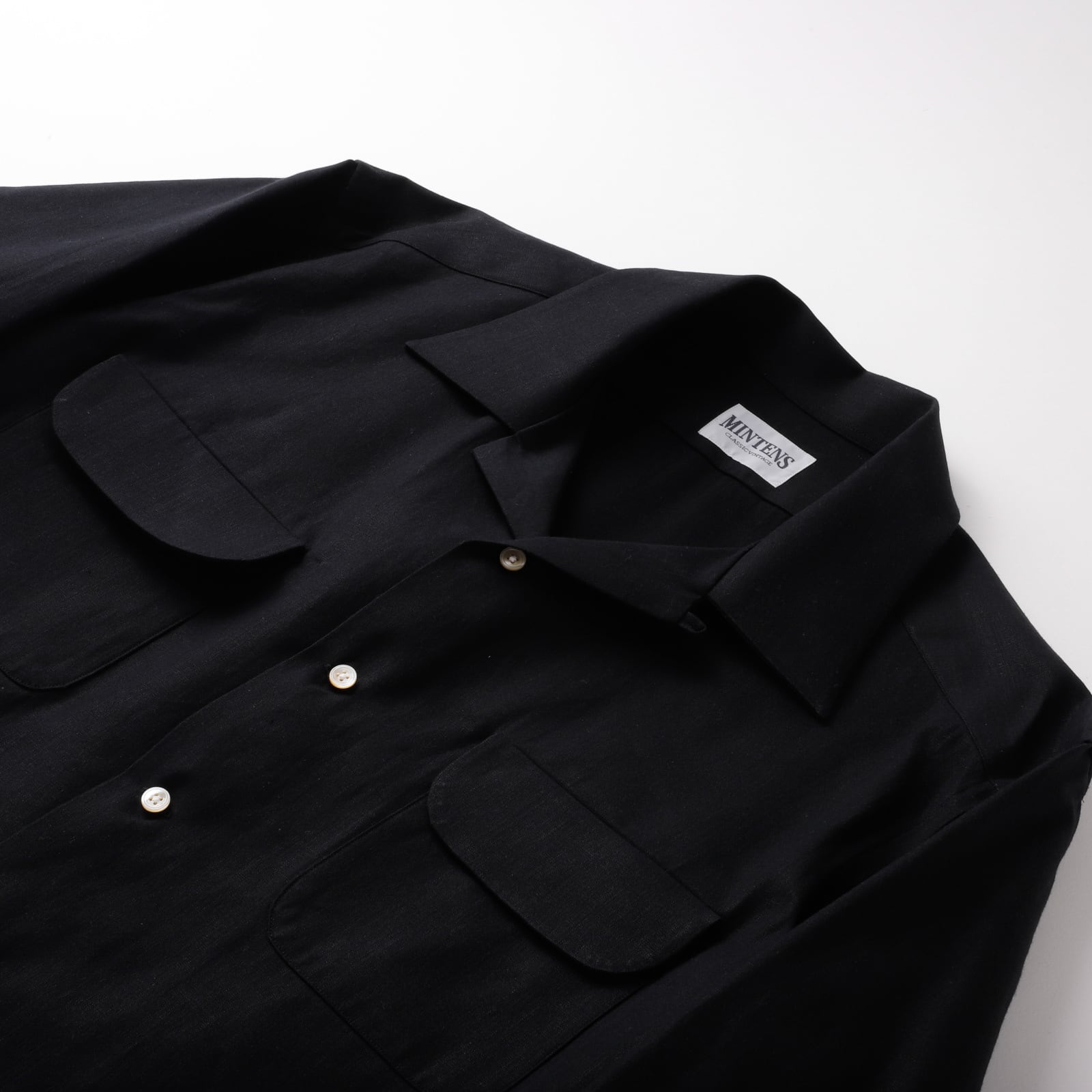【新品】MINTENS 1960s shirts made in JAPAN fabrics dead stock Black chambray made in OKAYAMA/ 日本製 岡山 ブラックシャンブレー生地 コットン オープンカラー シャツ ブラック オリジナルブランド 1960年代シルエット サイズ①
