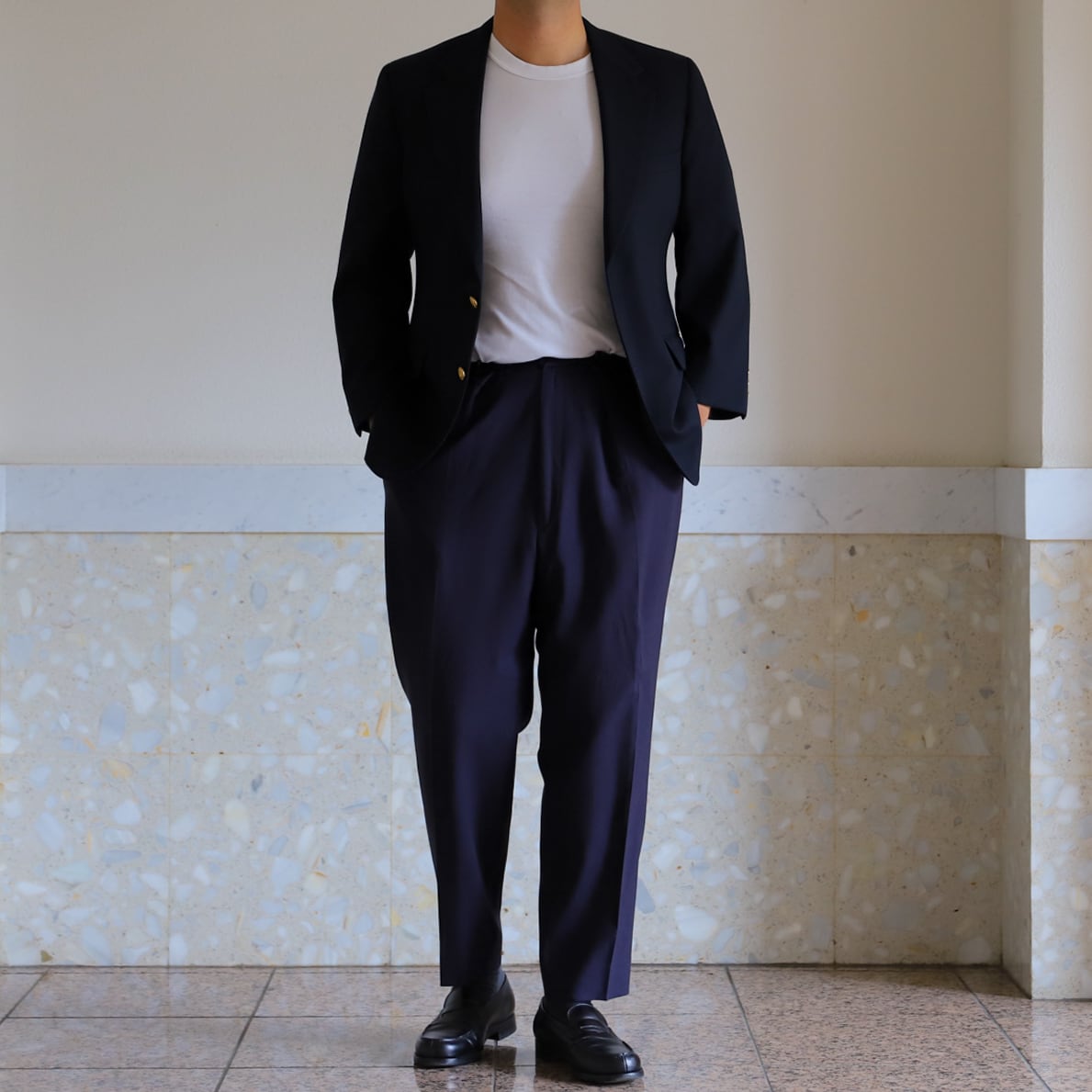 フォーマル合わせでも素敵ですが、サラッと羽織ってスラックスやデニム、ミリタリー パンツなどに合わせるのも抜群。